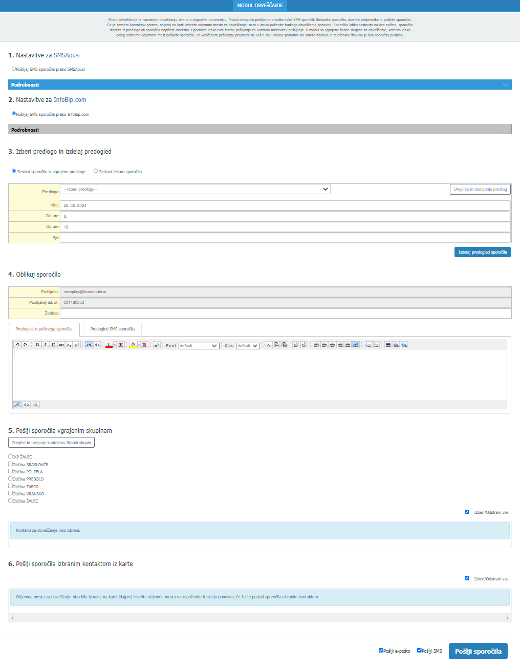 Modul OBVEŠČANJE je namenjen obveščanju občanov za potrebe nujnih situacij ali situacij informativnega značaja, kot so na primer potrebe po prekuhavanju vode, zaprtju vode na območju, ogroženosti pred poplavami, seznanitev o javni razgrnitvi in še kakšnih drugih situacijah.