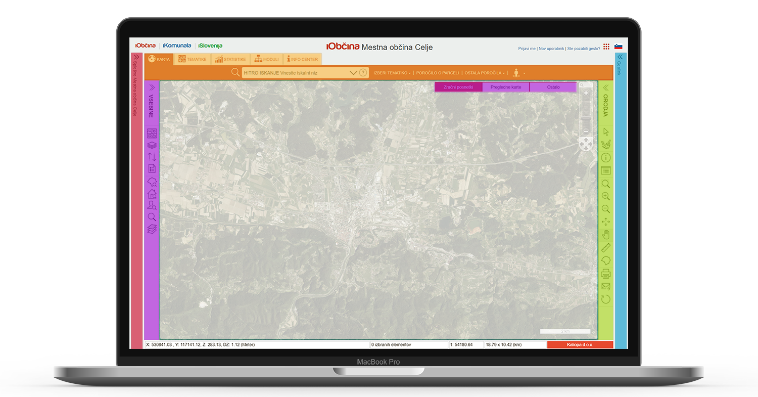 Zavihek karta je namenjen za prikazovanje vektorskih in rastrskih prostorskih podatkov. Pod zavihkom se odpre podmeni, ki je sestavljen iz hitrega iskalnika in gumbov za hitri dostop.