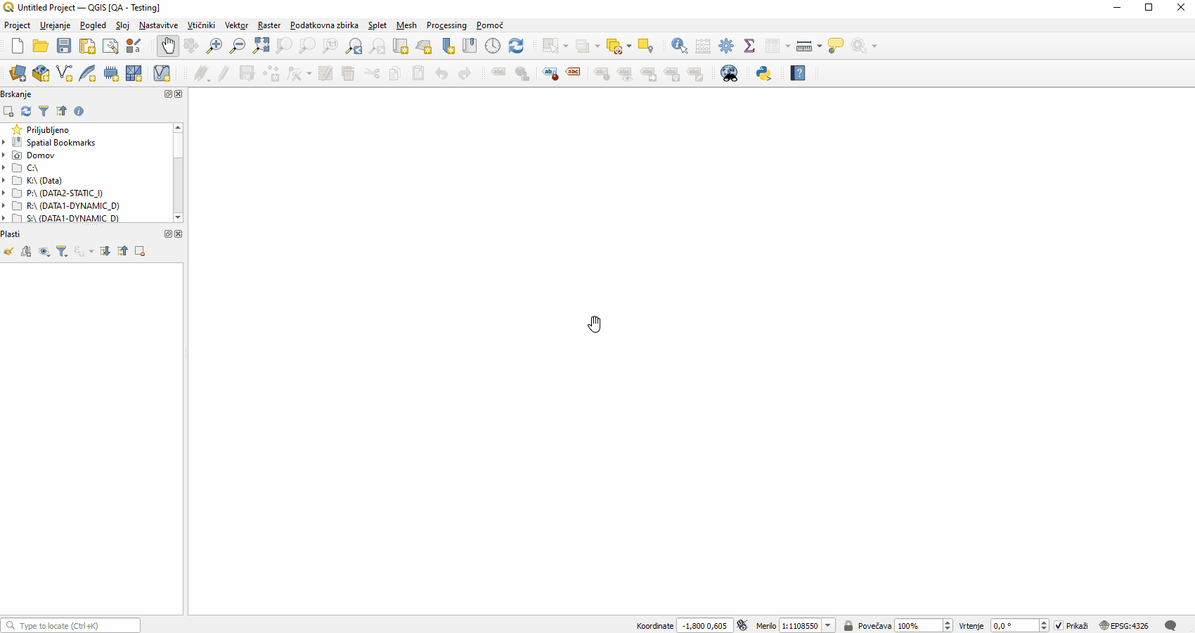 1. Zaženemo QGIS in v orodni vrstici zgoraj poiščemo  Vtičniki -> Manange and Install Plugins